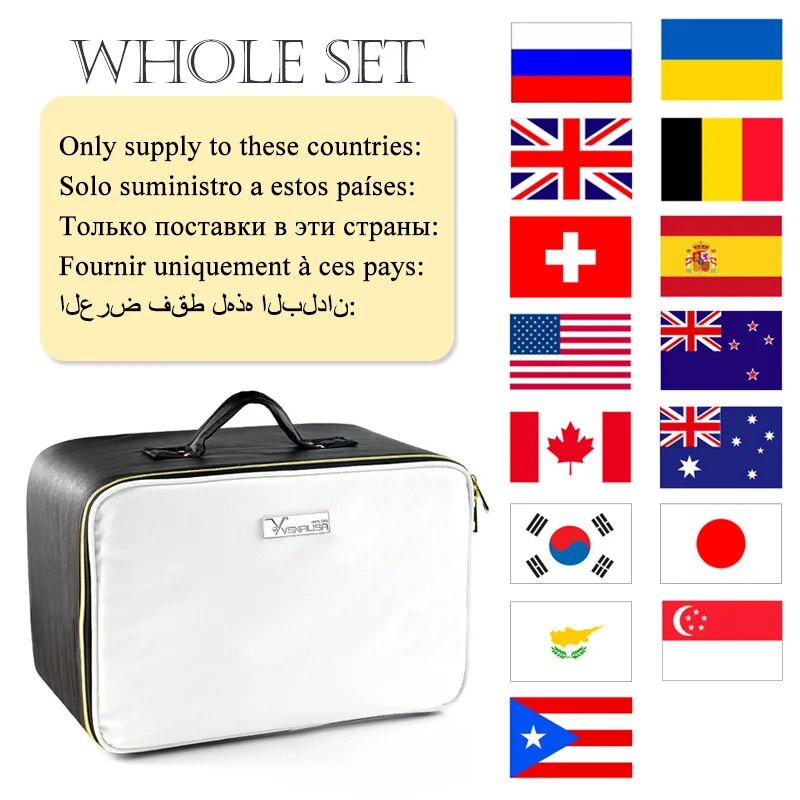 This whole set package only send to USA, Canada, South korea, Isreal. Singapore and part of EU countries, because some other country only can send by post mail, post mail have 2kgs weight limit, we have to send this kit by several separet parcels,so your parcel may without outside box or leather suitcase. your understanding is appreciated!